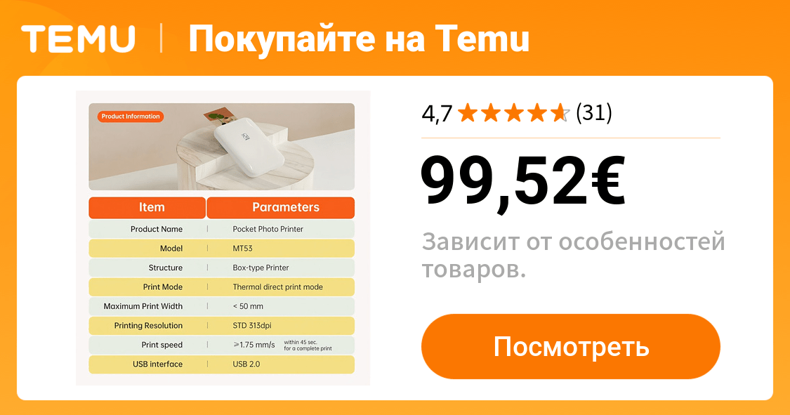 компактный фотопринтер высокой четкости с 5 листами - Temu France