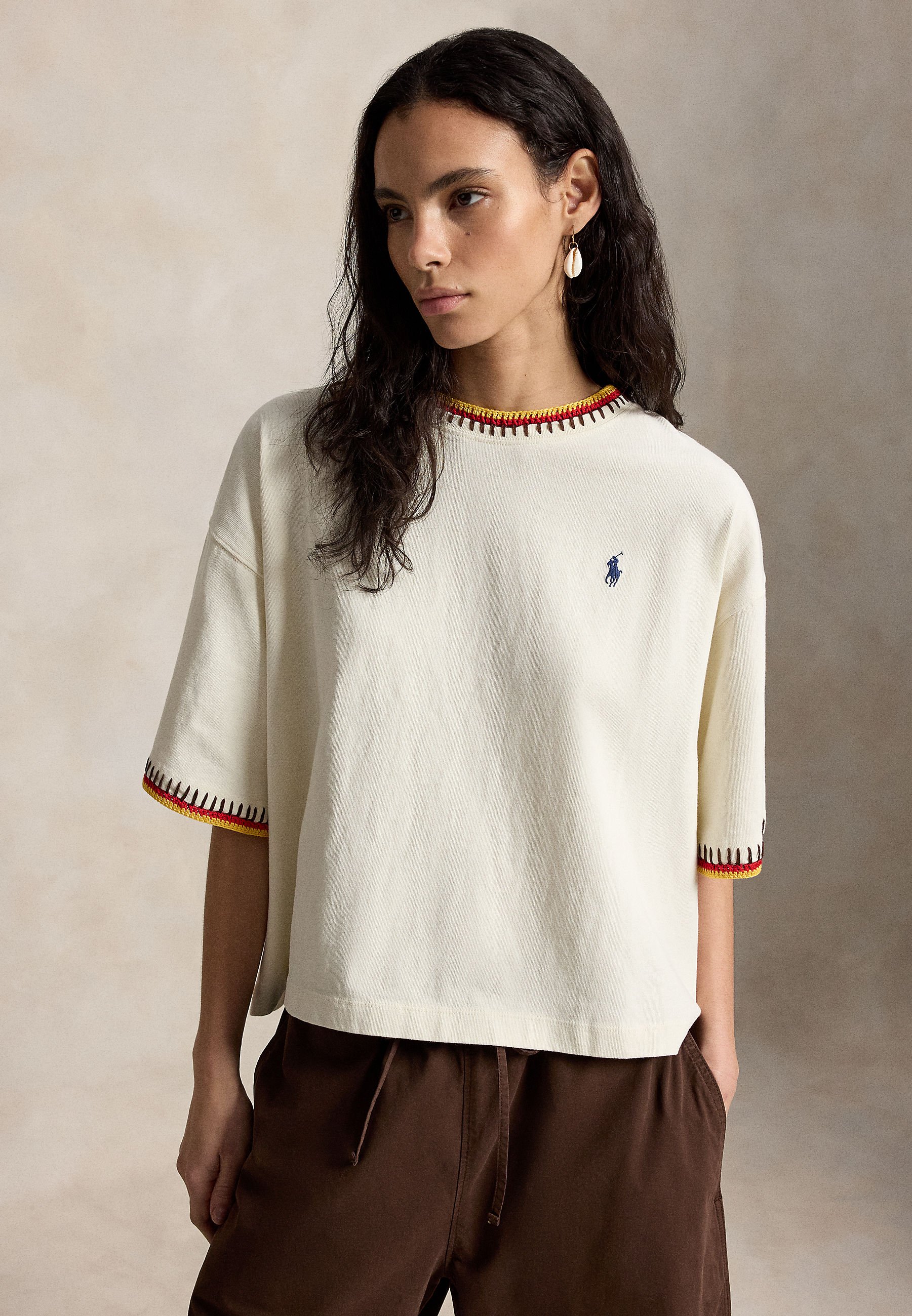 Polo Ralph Lauren CROCHET-TRIM COTTON JERSEY TEE - T-shirt imprimé - parchment cream/écru - ZALANDO.FR